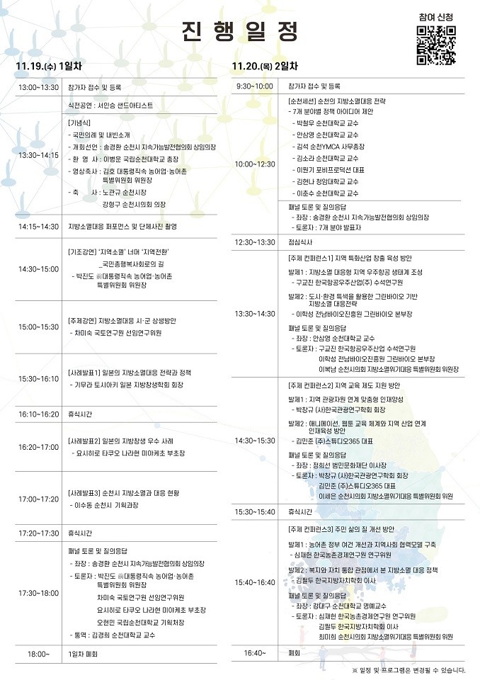 행사 첫날에는 박진도 전 대통령직속 농어업·농어촌특별위원회 위원장의 기조강연을 시작으로 주요 연구자들이 국가 전략과 지역 간 상생 모델, 해외 대응 사례 등을 발표한다. 일본 지방창생을 대표하는 기무라 토시아키 일본 지방창생학회 회장과 요시히로 타쿠오 미야케초 부정장은 일본의 경험을 공유하며, 순천시의 대응 현황 발표 및 전문가 패널 토론이 이어진다.