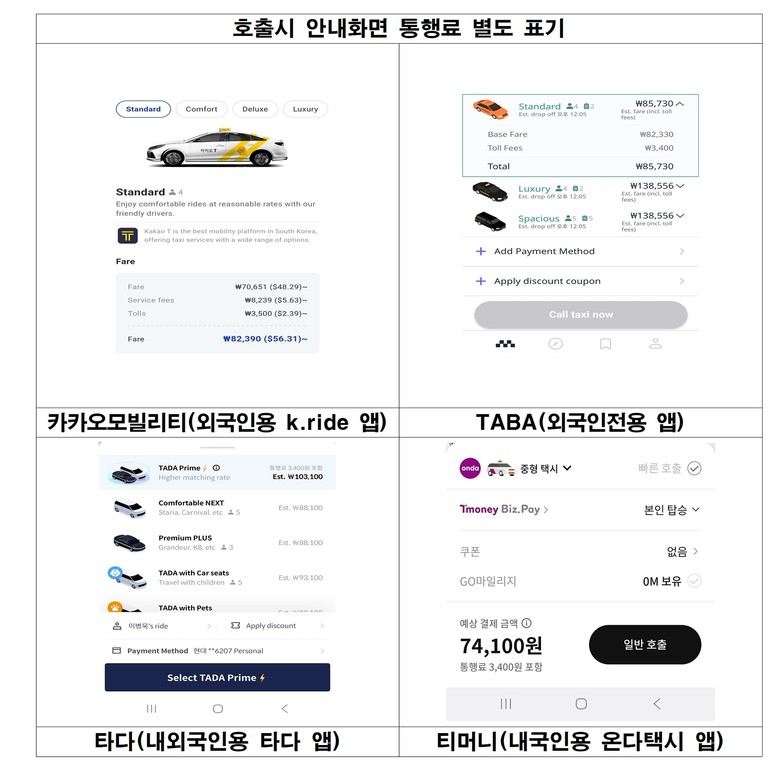 또 외국인 전용 택시 앱(▴카카오모빌리티 K.ride ▴TABA), 내.외국인용 택시 앱(▴타다 ▴온다)에서 택시 호출 시, 외국인이 항목별 예상 요금을 미리 확인할 수 있도록 운행 요금과 ‘유료도로 통행료’를 구분해 표시키로 했다.