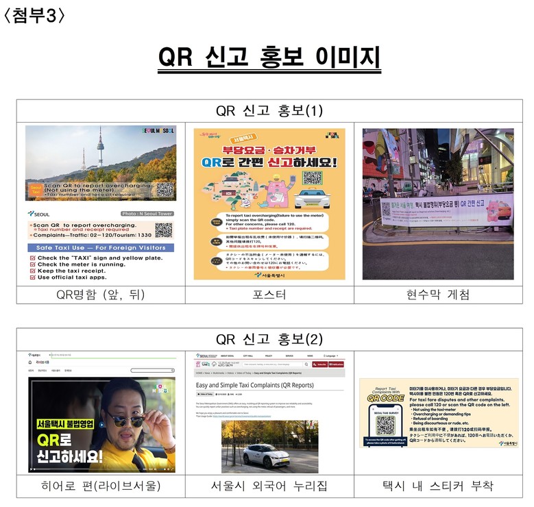 서울시는 외국인이 택시 이용 중 부당요금이나 불편을 겪었을 경우 현장에서 바로 신고할 수 있도록 택시 내부 및 주요 관광지 등에 ‘QR 택시 불편신고 시스템’ 안내 스티커.현수막.포스터를 부착하고, 서울시 공식 SNS를 통해서도 지속적으로 홍보하고 있다.