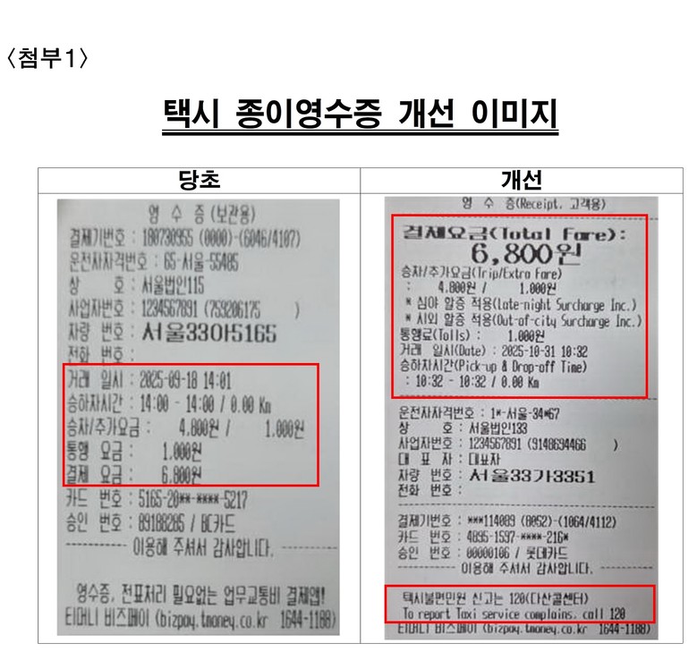 시는 지금까지 택시에서 발행하는 종이 영수증은 ‘한글’로만 표기되는 데다 할증 여부를 볼 수 없어 외국인이 탑승했을 때 택시기사가 시계외 할증 버튼 등을 악용, 부당요금을 징수할 수 있는 단점을 보완하기 위해 개선에 나섰다고 설명했다.
