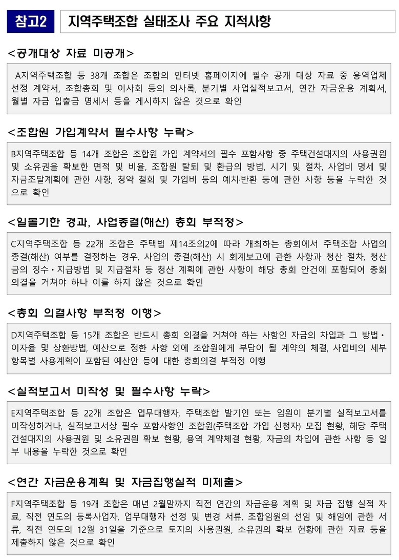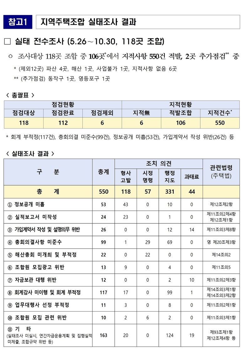 ▴총회의결 미준수.해산총회 미개최 등 57건은 시정명령 후 미이행 시 고발 ▴자금보관 대행 위반, 조합 가입계약서 부적정 등 44건은 과태료 부과 ▴연락두절.사업중단 등으로 실태조사 미실시 고발 15건 ▴수사의뢰 14건 등 조치키로 했다.