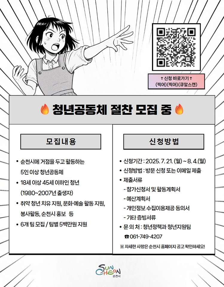 자세한 내용 및 신청 서식은 순천시청 누리집 공고란에서 확인할 수 있으며, 문의 사항은 순천시 청년정책과(061-749-4207)에서 안내받을 수 있다.