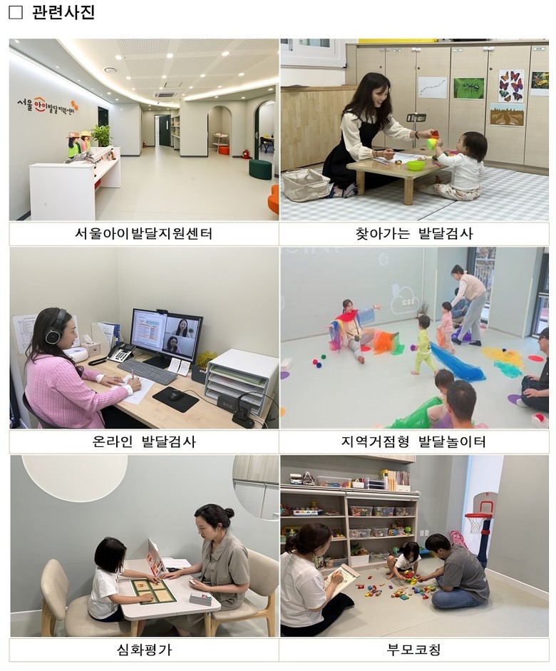 ‘서울아이발달지원센터’(동작구 노량진로 10 서울가족플라자 2층, 이하 ‘센터’)는 언어‧인지 등 발달의 주요시기인 영유아에게 전문가가 무료 발달검사를 해주고, 검사 결과에 따라 심화평가, 부모코칭, 치료 연계까지 원스톱으로 지원하는 전국 최초의 시설로, 지난 2023년 6월 문을 열었다. 아동 발달에 조기 개입해서 영유아의 건강한 성장을 지원하는 것을 목표로 한다.