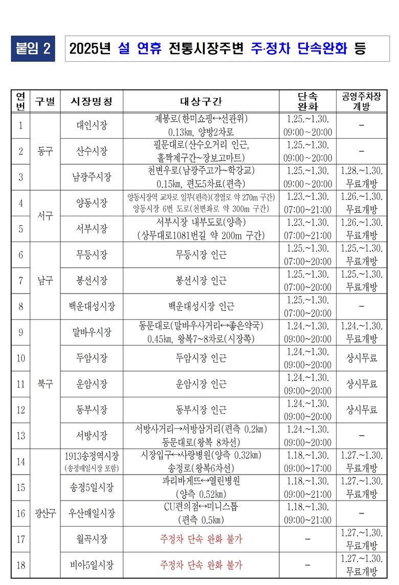 불법 주·정차 단속를 완화하는 전통시장은 ▲동구 대인시장·산수시장·남광주시장 ▲서구 양동시장·서부시장 ▲남구 무등시장·봉선시장·백운대성시장 ▲북구 말바우시장·두암시장·운암시장·동부시장·서방시장 ▲광산구 1913송정역시장(송정매일시장 포함)·송정5일시장·우산매일시장 등 16곳이다.