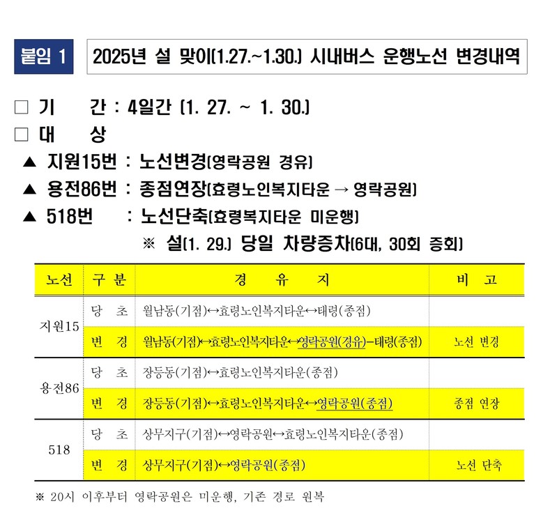 상무지구~종합버스터미널~영락공원을 운행하는 518번 시내버스는 설 당일(29일) 30회 증차 운행하고, 월남동~태령을 운행하는 지원15번 시내버스는 영락공원을 경유 운행한다. 효령노인복지타운이 종점인 용전86번 시내버스는 영락공원까지 연장 운행하는 등 시내버스 노선을 조정한다.