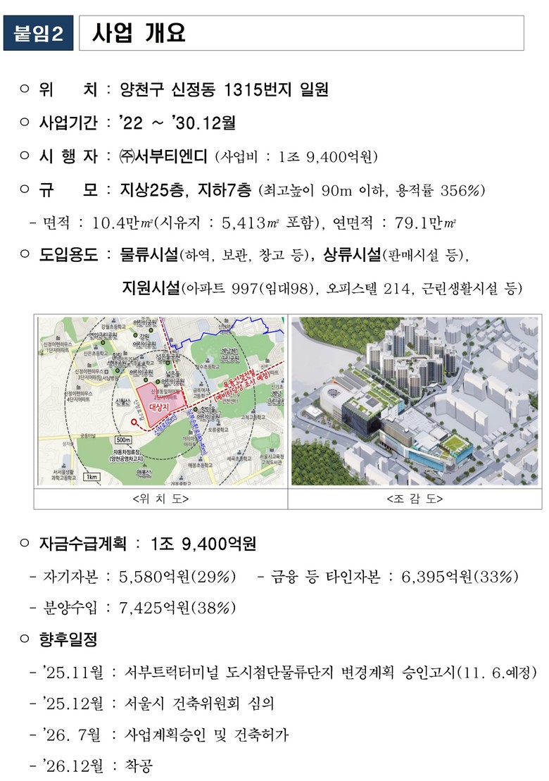 현재 ‘서부트럭터미널 도시첨단물류단지’는 원활한 추진을 위해 행정절차 등 사업 단계를 진행 중이다. 향후 양천구청의 주택건설 사업계획승인 및 건축허가 등을 거쳐 ’26년 하반기 중 착공해 ’30년 하반기에 준공 예정이다.
