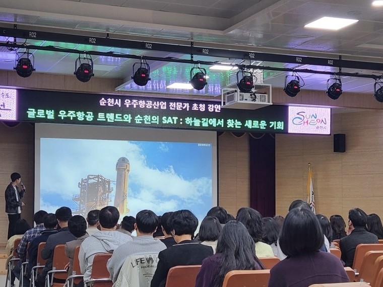 이번 강연은 ‘엑소쌤’으로 활동하고 있는 이선호 과학커뮤니케이터를 초청해 「글로벌 우주항공 트렌드와 순천의 SAT : 하늘길에서 찾는 새로운 기회」라는 주제로, 우주산업의 산업동향과 시 정책을 공유하는 자리로 마련됐다.