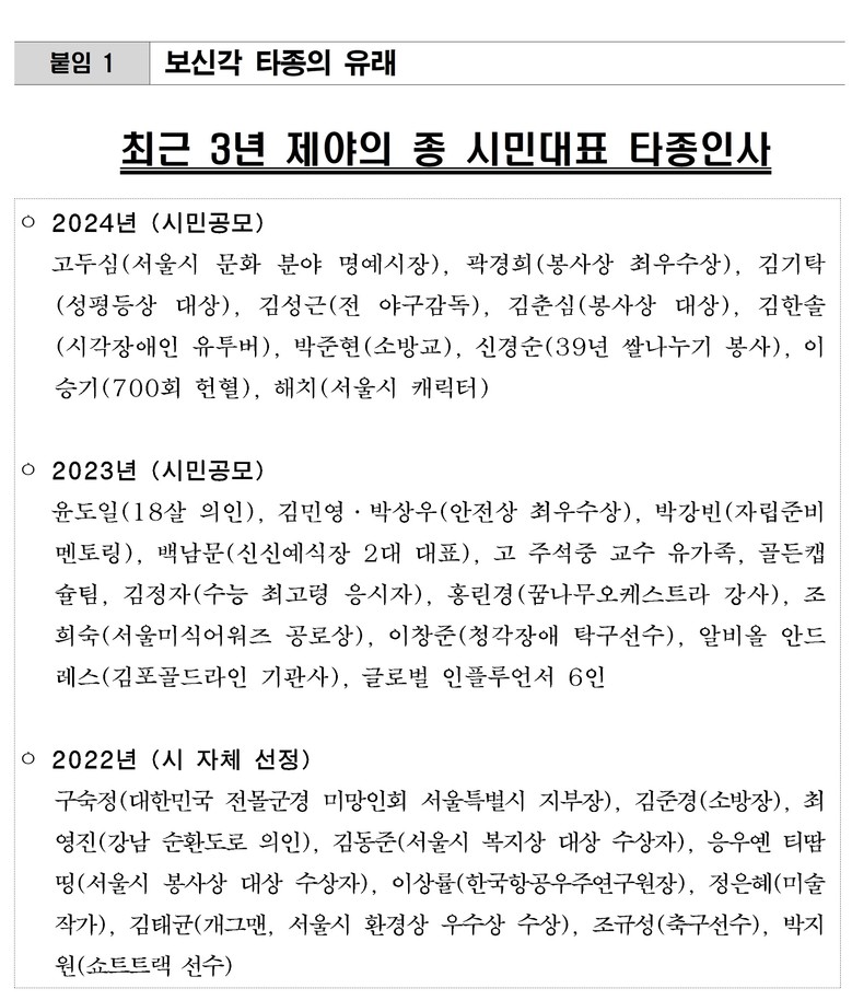 타종인사 추천대상자는 ▴국민에게 희망을 준 인물, ▴나눔 실천, 역경 극복, 용감한 시민 등, ▴기타 화제의 인물로 사회 각계에서 올해를 빛낸 이들이다.
