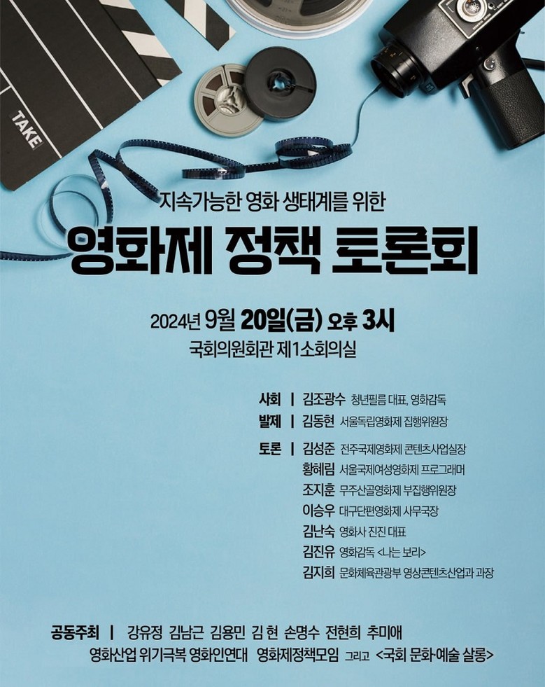 본 토론회는 더불어민주당 강유정, 김남근, 김용민, 김현, 손명수, 전현희, 추미애 의원실과 영화산업 위기극복 영화인연대, 전국 14개 영화제 소속 구성원들의 연대체인 영화제정책모임, 국회 문화·예술 살롱이 공동주최하며, 2024년 영화제 지원현황 및 예산삭감 여파를 진단하고 지속가능한 영화 생태계를 위한 영화제의 사회문화적 역할과 가치, 영화제 지원제도의 문제점과 개선방향 모색을 위해 마련된 자리이다.