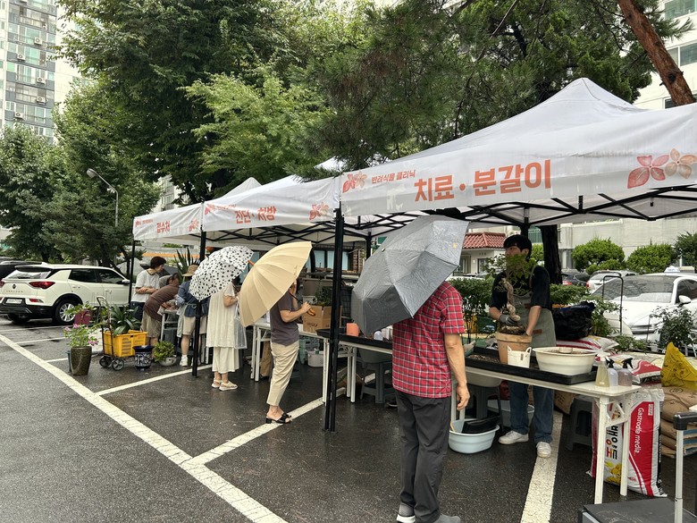 | ▲ 도봉구민이 도봉구 지역 내 한 아파트에 마련된 ‘찾아가는 반려식물 클리닉’에서 상담을 받고 있다. |