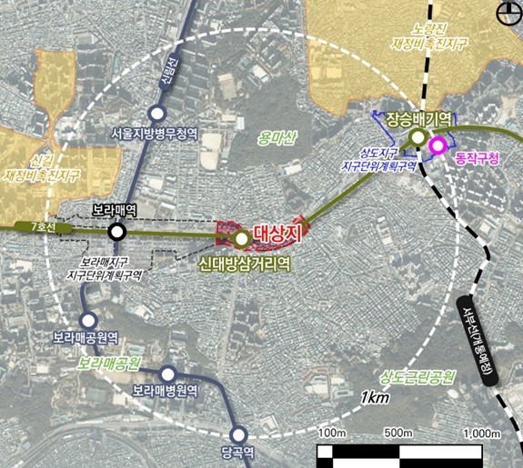 대상지는 지하철 신대방삼거리역(7호선) 일대로, 서측으로는 보라매역(7호선·신림선), 동측으로는 장승배기역(7호선·서부선(예정))이 위치하고 있어 광역교통의 중간적 요충지로서 위상과 기능이 강화되고 있는 지역이다.