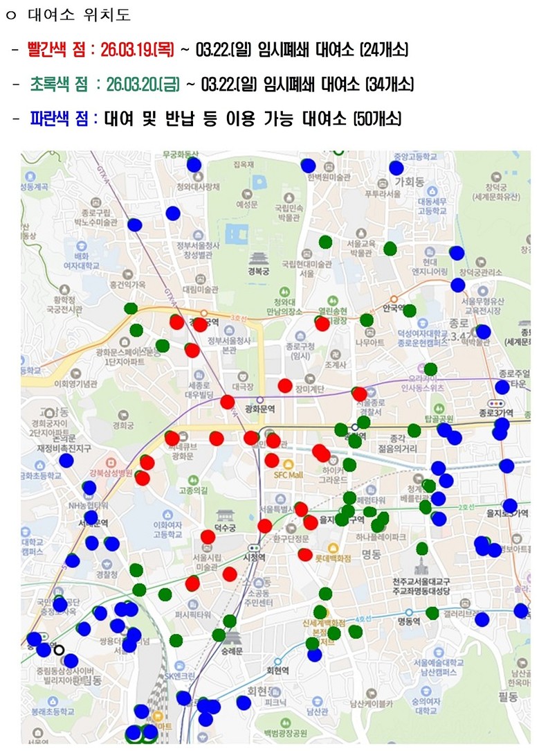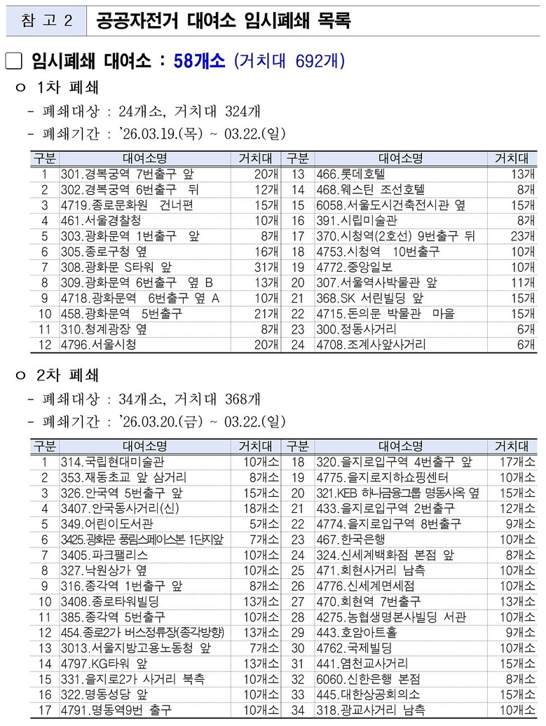 보행자 안전을 위해 인근 1km내에 위치한 58개 따릉이 대여소, 거치대 692대운영이 중단된다. 1차로 3. 19.(목) 09시부터 24개소 순차적 폐쇄하여 3. 22.(일) 09:00까지 폐쇄된다. 2차로는 3. 20.(금) 순차적 폐쇄 조치 후 3. 22.(일) 09:00까지 폐쇄된다.