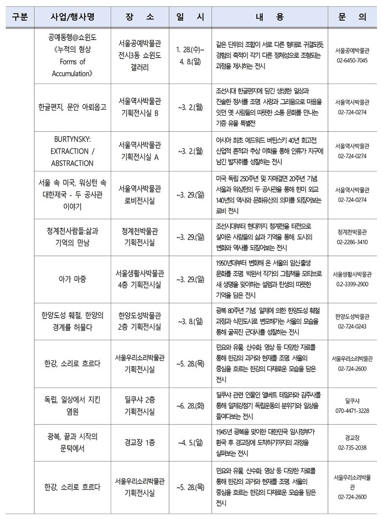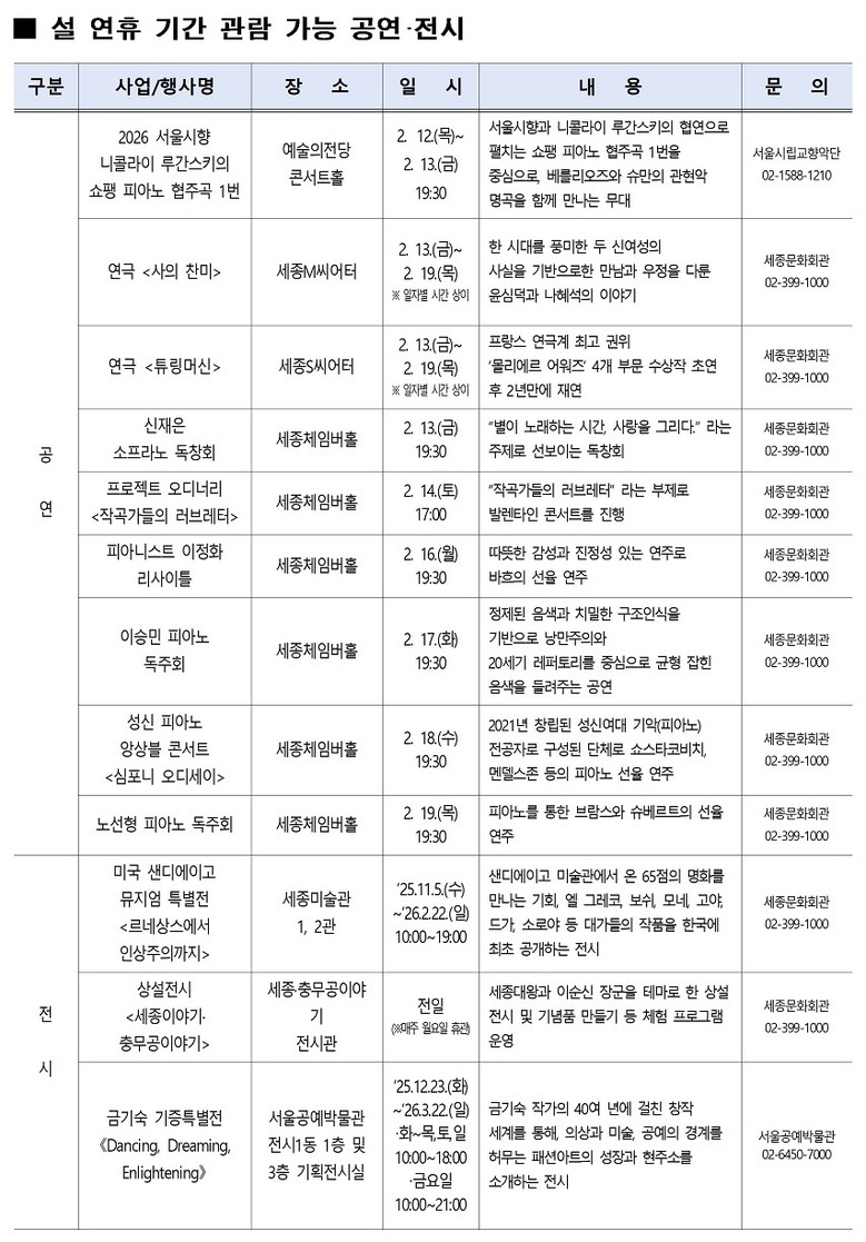 ▴서울공예박물관 ▴서울시립미술관 ▴세종문화회관 등 주요 전시.문화시설도 설 연휴 기간 휴무 없이 운영되며 전시와 예술 공연을 선보인다.