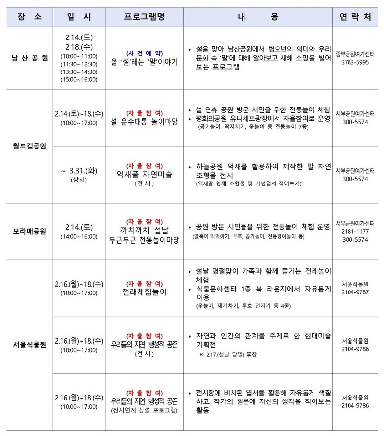 14일(토).18일(수) 오전 10~16시 ▴남산공원에서는 병오년 말띠 해의 의미를 되새기고 소망을 빌어보는 체험 프로그램(총 4회)이, 21일(토) 14~16시에는 ▴보라매공원에서 놀이활동가와 함께 우리 고유의 문화를 체험해 보는 ‘까치까치 설날 두근두근 전통놀이마당’도 진행된다.
