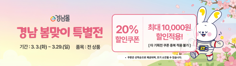 - 시군 지역사랑상품권 사용 시 10~12% 추가 할인 효과 [세계타임즈=경남 최성룡 기자] 경상남도와 (재)경상남도투자경제진흥원이 운영하는 e경남몰(egnmall.kr)이 3월 3일부터 예산 소진 시까지 ‘2026년 봄맞이 할인 기획전’을 진행한다.