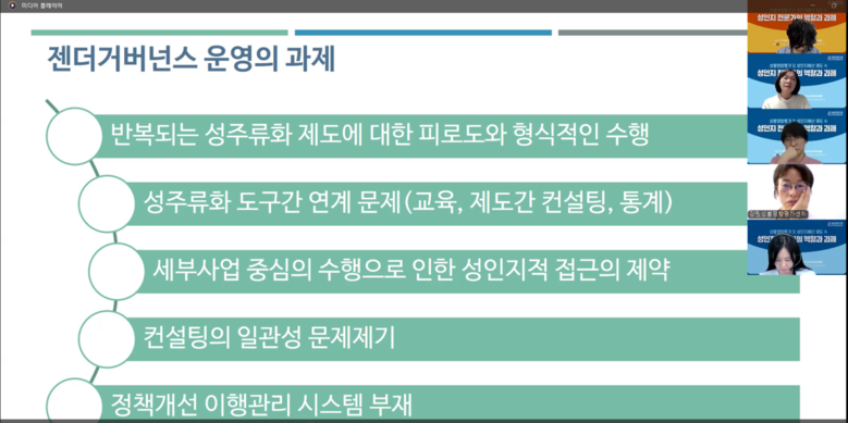 포럼은 주제발표와 지정토론으로 이어졌다. 제도 운영에서 성인지 전문가의 역할과 과제에 대해 김정민 강원성별영향평가센터 컨설턴트가 발표했고, 컨설턴트와 공무원의 협업 과정이 성공하기 위한 요건과 제도 개선 방안에 대해 박사옥 경기성별영향평가 센터장이 발표했다. 이어 성별영향평가 컨설턴트단 운영을 위한 센터의 역할과 과제에 대해 허은희 경남성별영향평가센터 센터장이 발표했다. 각 주제발표에 후에 서지희 서울성별영향평가센터 전담연구원, 윤금이 천안시 여성가족과 성평등전문관, 남정연 중앙성별영향평가센터 전담연구원이 토론을 진행했다. 마지막으로 참여자 전원이 참여하는 라운드테이블 토론을 통해 성별영향평가·성인지예산 제도 발전을 위한 다양한 의견을 들었다.