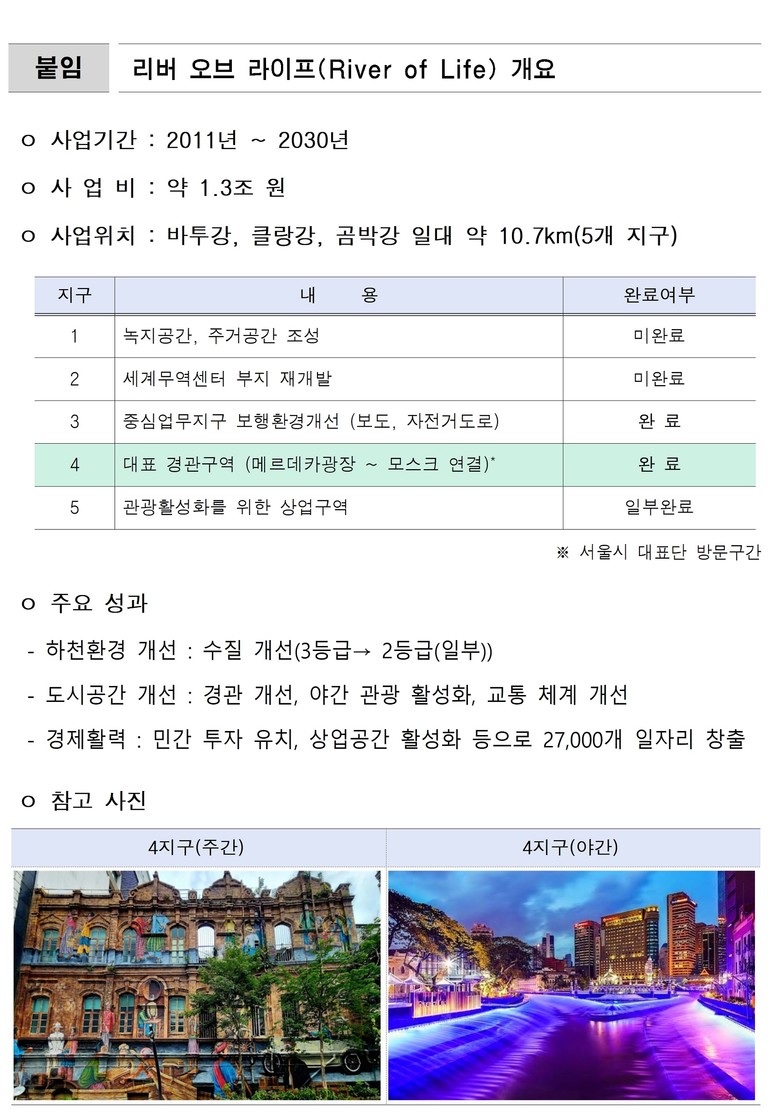 6일(토) 20시<현지시각> 오 시장은 쿠알라룸푸르 클랑강.곰박강 일대 수변을 복원하고 경관을 개선, 주변 상권에 활력을 불어넣고 관광 활성화에 성공한 ‘리버 오브 라이프(River of Life)’를 방문했다.