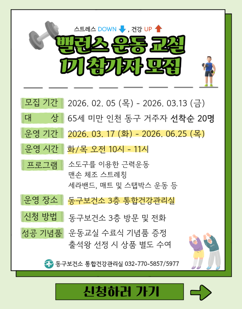 한편 기타 자세한 사항은 동구보건소 통합건강관리실(032-770-5857, 5736)로 문의하면 된다.