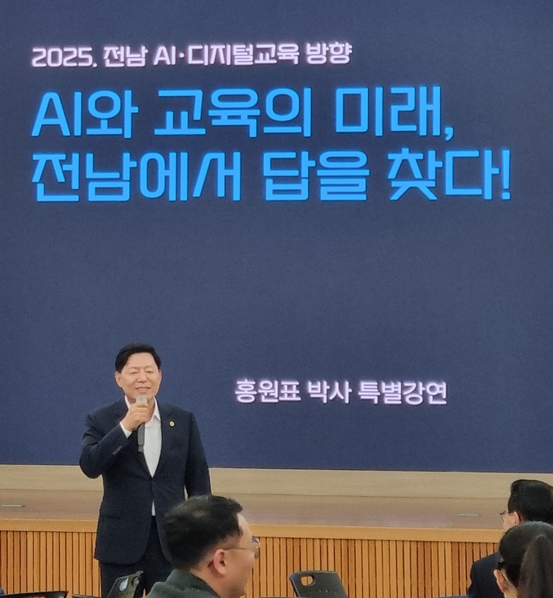 [전남 세계타임즈=우덕현 기자] 김정희 전라남도의회 교육위원장은 9월 19일(금), 전남교육청이 개최한 「2025 전남 AI‧디지털 교육 방향 특별강연」에서 축사를 통해 미래 교육의 방향성을 제시했다. 이번 강연에는 SK쉴더스 홍원표 고문이 연사로 나서 인공지능과 디지털 전환이 불러올 교육 혁신 과제를 함께 논의했다.