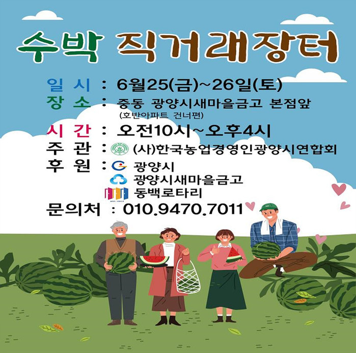 [광양=세계타임즈 이혜원 기자] 광양시는 한국농업경영인 광양시연합회 주관으로 ‘코로나19 극복을 위한 수박 직거래장터’를 중마동 새마을금고 본점 주차장에서 6월 25~26일(2일간) 운영한다.