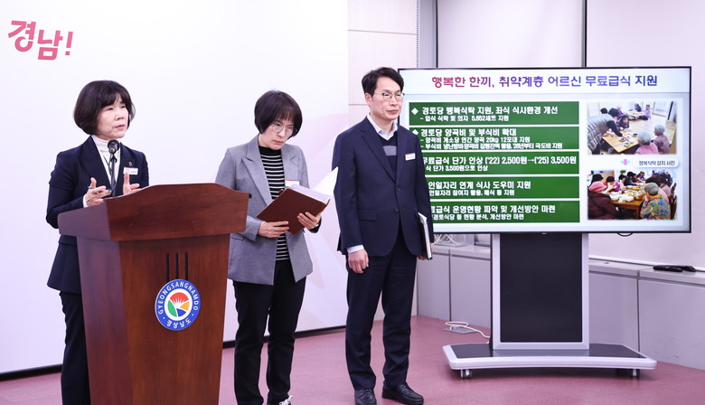 현재 경남도는 어르신의 식사‧가사 등 일상생활 지원을 위해 거주지와 가깝고 마을 어르신 친목의 공간이자 폭염‧한파 쉼터로 활용되는 경로당에 급식을 제공하고 있으며, 올해는 주 5일 급식 제공을 목표로 하고 있다.