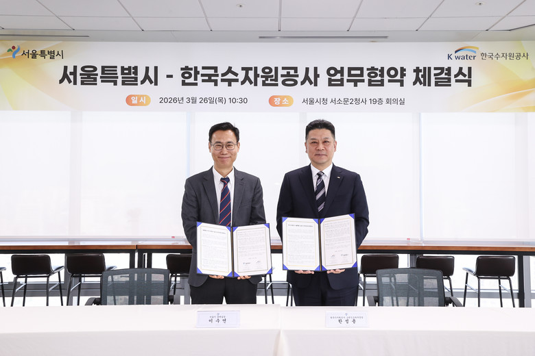 | ▲ 이수연 서울시 경제실장(왼쪽)과 한성용 한국수자원공사 그린인프라부문장이 26일 서울시청 서소문2청사에서 ‘K-테스트베드 실증 및 판로지원 업무협약’을 체결한 뒤 협약서를 들고 기념촬영하고 있다. |