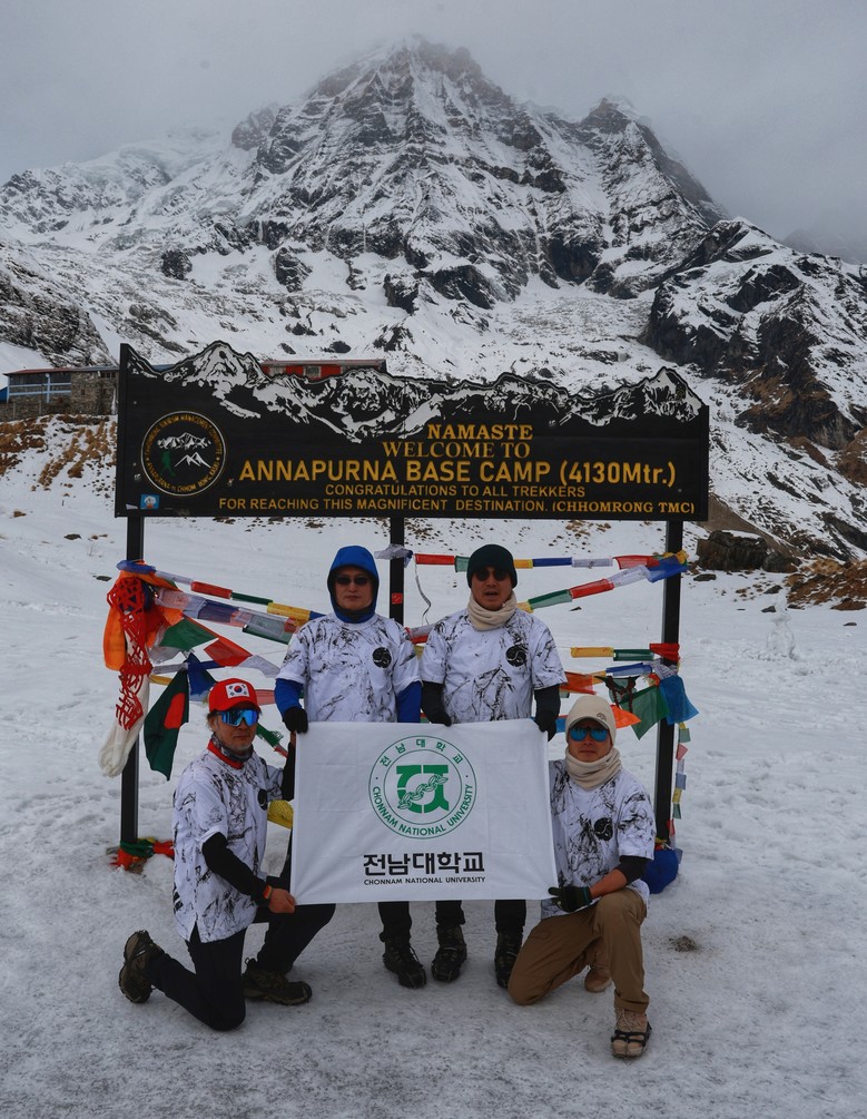 ▲ 전남대학교 원정대의 기념 촬영 모습(사진 뒤에 왼쪽이 정용석 대원, 오른쪽이 김동문 대원, 사진 아래 왼쪽이 박종은 대원, 오른쪽이 이주환 대원) |