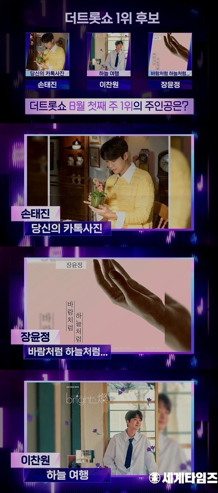 1위 후보곡은 2주 연속 1위를 차지하며 많은 이들의 사랑을 받고 있는 손태진의 ‘당신의 카톡사진’과 국악과 양악이 절묘한 하모니를 이루며 모두의 마음을 울린 이찬원의 ‘하늘 여행’, 발매 이후 꾸준한 사랑을 받고 있는 돌아온 트롯 퀸 장윤정의 ‘바람처럼 하늘처럼…’이 선정됐다. 손태진은 지난 3월 ‘참 좋은 사람’에 이어 개인 통산 2번째 명예의 전당을 입성을 할 수 있을지 이목이 집중되고 있다.