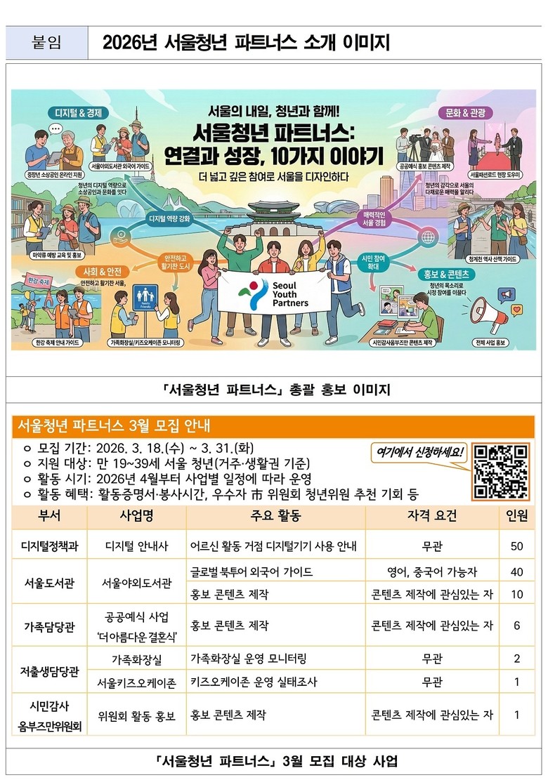 시는 올해 서울 청년 파트너스가 활동할 12개 사업 중 6개 사업에 대해 활동 희망 청년을 우선 모집한다. 모집 기간은 3월 18일(수)부터 31일(화)까지이며, 자세한 내용은 청년 몽땅 정보통 내 공지사항을 확인하면 된다.