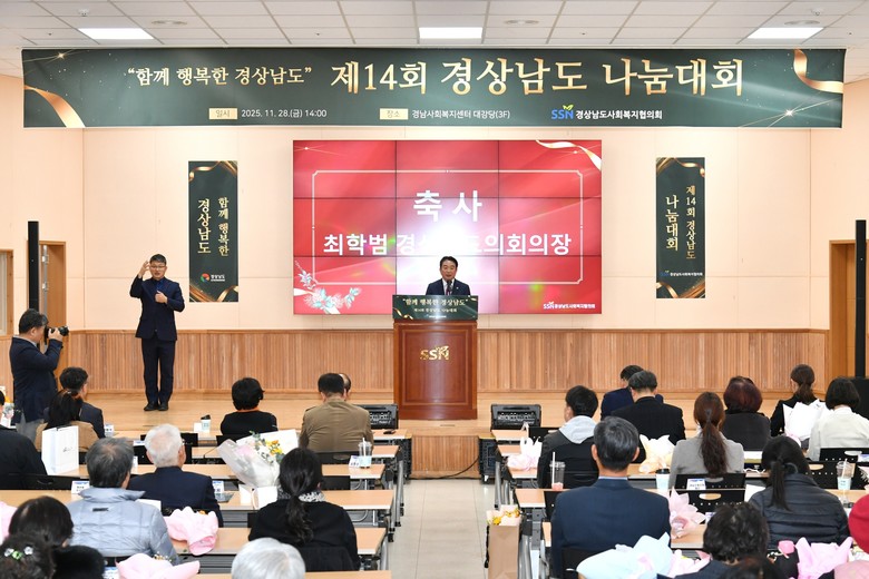 [경남 세계타임즈=최성룡 기자] 경상남도의회 최학범 의장은 11월 28일 창원시에 소재한 경남사회복지센터에서 열린 ‘제14회 경상남도 나눔대회’에 참석해 지역사회 나눔문화 확산에 기여한 자원봉사자와 사회공헌 유공자들을 격려했다.