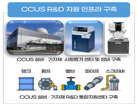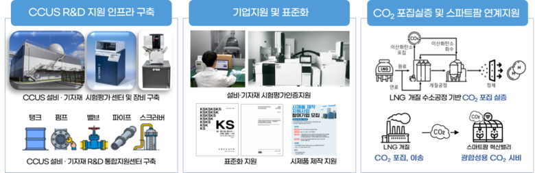 또한, 해외 의존도가 높은 국내 CCUS 공정의 국산 기술개발 및 설비·기자재 성능 확보.향상을 위한 지원 체계를 마련한다. 2030년까지 총사업비 230억원을 투입하여 △전문 시험‧분석 지원 센터 건축 △ 설비 및 기자재 시험‧평가 장비 구축 △ CCUS 인증체계 마련 및 표준화 지원 등의 업무를 수행할 예정이다.