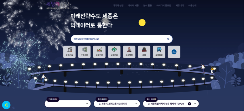 특히 세종시 유동 인구, 소비 흐름을 한눈에 볼 수 있는 ‘데이터세종’ 메뉴를 새로 만들고 앞단에 배치해 활용도가 높은 데이터를 빠르게 찾아볼 수 있도록 했다.