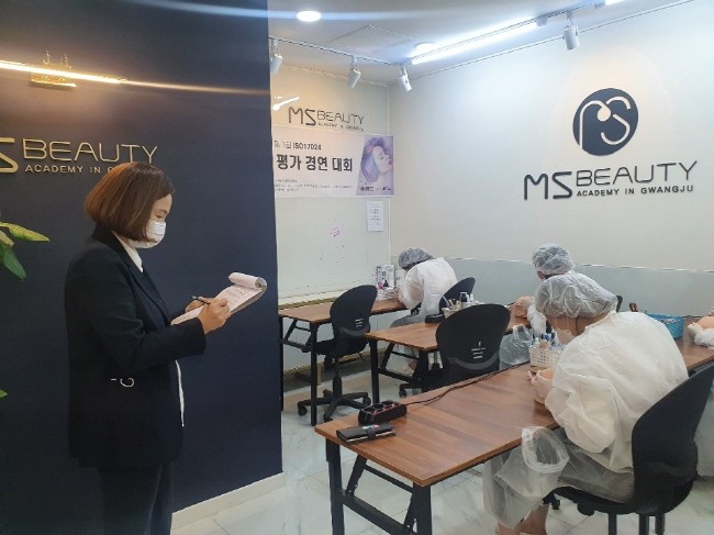(사진=지난 20일 'MS뷰티 아카데미 광주'에서 제1회 ISO17024 국제미용평가경연대회 참가자들이 뷰티 디자인 시연을 하고 있다. 서울=전국기자협회)