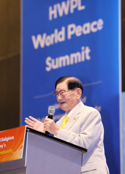 | ▲21일 오전 그랜드 하얏트 인천에서 열린 HWPL 9·18 평화 만국회의 9주년 기념식 ‘세계 종교평화아카데미 특강’에서 이만희 대표가 발언하고 있다. |