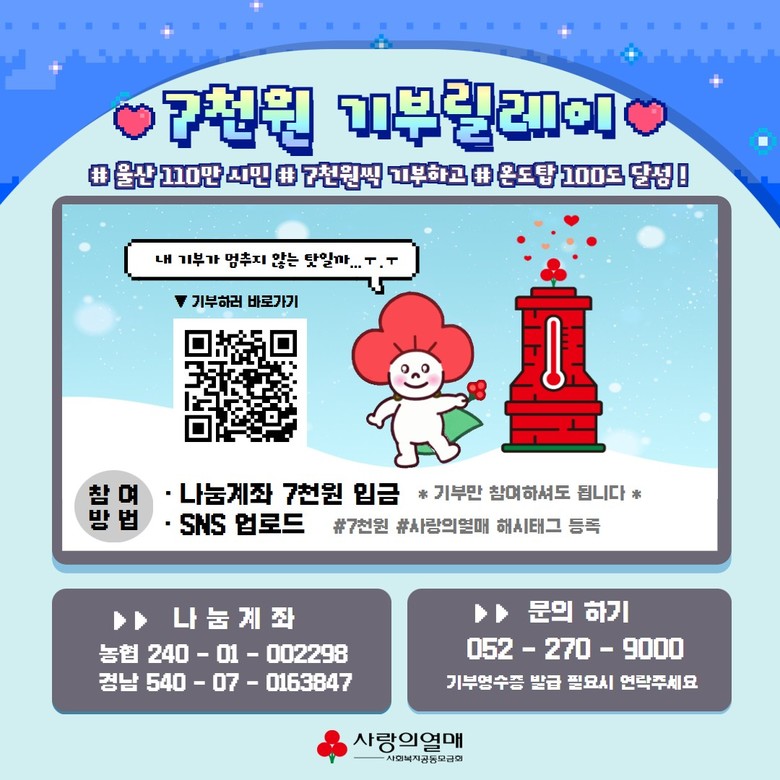 기부는 스마트폰 정보무늬(QR코드)와 나눔 계좌를 통해 참여할 수 있다. 문의는 울산사회복지공동모금회(052-270-9000)로 하면 된다.