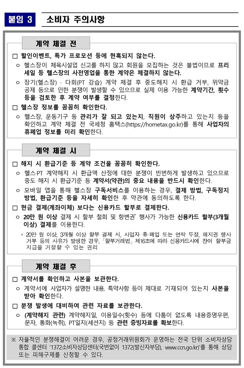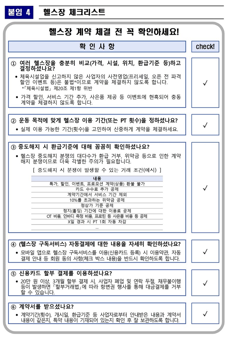 서울시는 헬스장 계약 전 ▲할인이벤트로 유인하는 장기(다회)계약에 신중할 것 ▲사업자의 폐업·연락두절 사태 등에 대비하여 20만 원 이상 결제 시 가급적 신용카드로 3개월 이상 할부 결제할 것 ▲계약체결 시 사업자와 추가 협의한 내용 등은 계약서에 기재하고 환급 기준을 확인할 것 ▲비대면거래로 체결되는 헬스장 구독서비스 이용 시 약관 내용을 꼼꼼하게 확인할 것을 강조했다.