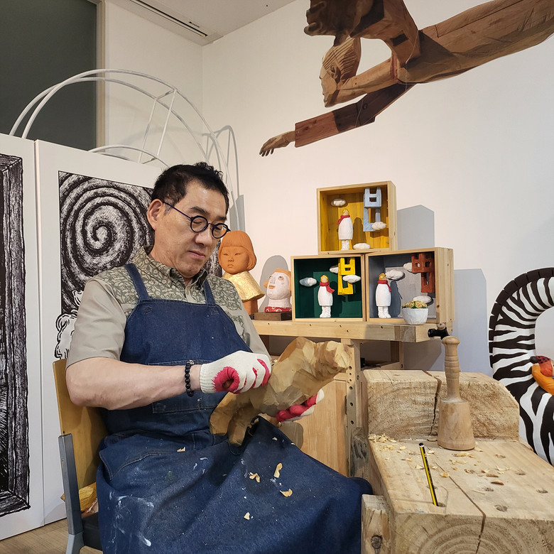 작가는 나무를 깎는 고된 노동의 과정을 ‘사유의 시간’으로 받아들인다. 이를 통해 자신과 관객의 감정이 교류・치유되는 예술의 가능성을 실현하고자 한다. 그는 조각을 통해 삶의 서사와 내면의 기억을 조형적으로 풀어내는 작업을 지속해오고 있다. 특히 나무라는 재료에 오랜 시간 공을 들여 자아와 감정의 흔적을 새기는 그의 작업은 관객의 깊은 공감과 감성을 이끌어낸다.