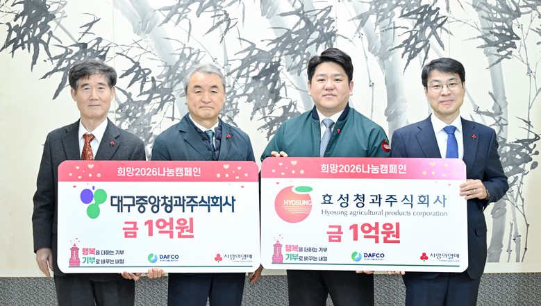 이상윤 대구중앙청과 대표와 김형수 효성청과 대표는 “추운 겨울을 보내고 있는 이웃들에게 조금이나마 보탬이 되길 바란다”며, “앞으로도 단순한 농산물 유통을 넘어 따뜻한 온기를 전하는 상생의 파트너로서 역할을 다하겠다”고 말했다.