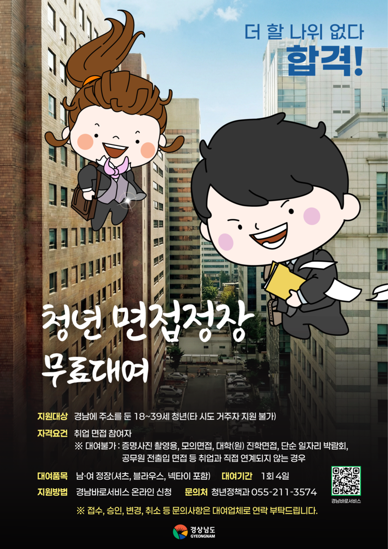 한미영 경남도 청년정책과장은 “면접정장 무료대여 사업은 매년 구직 청년들로부터 높은 호응을 얻고 있다”라며, “올해는 1월 초부터 상시 이용할 수 있도록 개선한 만큼, 취업을 준비하는 청년들에게 실질적인 도움이 되기를 바란다”라고 말했다.