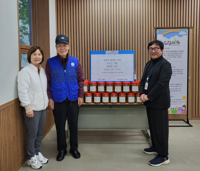 [강화군 세계타임즈=심하린 기자] 강화군(군수 박용철)은 지난 11월 3일 강화읍 바르게살기위원회(회장 차대성)가 드림스타트 사업 대상 가정에 직접 담근 맛된장(2kg) 100개를 전달했다고 밝혔다.