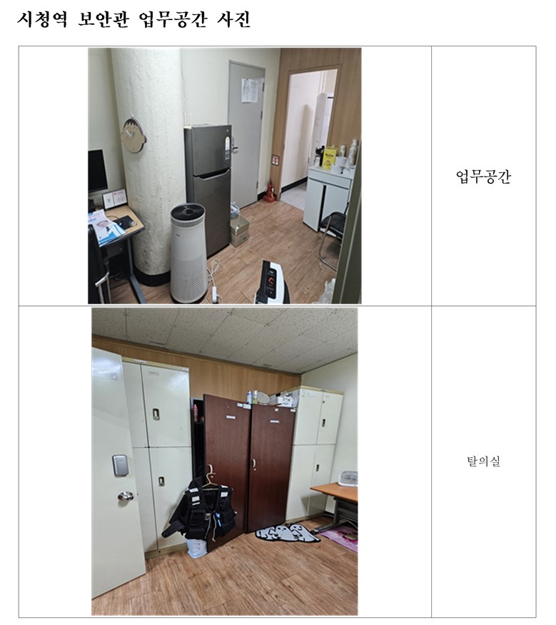 서울교통공사의 상위기관인 서울시청과 감사기관인 서울시의회가 위치한 시청역에 설치된 보안관 사무실 상황은 더욱 심각했다. 남녀 구분 없이 9명의 보안관이 4평 남짓한 공간을 탈의실까지 겸하며 사용하고 있었으며, 회의실에만 냉난방기가 설치되어 있어 탈의실 문을 열어야만 그나마 해당 설비를 간접적으로 이용할 수 있는 구조였다.