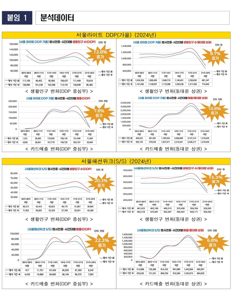 대표적으로 ’24년 열린 서울패션위크(S/S) 기간에는 생활인구가 ▴DDP 중심부 20.3% ▴동대문 상권 15.3% 크게 증가했다. DDP 매출은 22.3%, 동대문 상권 매출은 6.8% 늘었다.