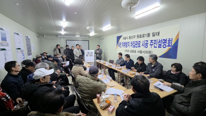 이번 주민설명회는 원효로1동 일대 주민들이 지속적으로 제기해 온 욱천 악취 문제를 해소하기 위해 추진 중인 ‘2025년 난지수계(욱천) 차집관로 덮개 설치공사’의 구체적인 사업 내용을 설명하고, 공사 일정과 방식에 대한 주민 이해를 돕기 위해 마련되어, 김 의원을 비롯해 김종희 서울시 난지물재생센터 소장과 관계자, 시공사 피엔알시스템 대표, 장학재단 시공사 현장소장 및 관계자, 인근 CJ나인파크와 e-편한세상 입주자대표회장 및 관리소장, 입주민과 욱천 인근 주민 등 약 40여 명이 참석했다.