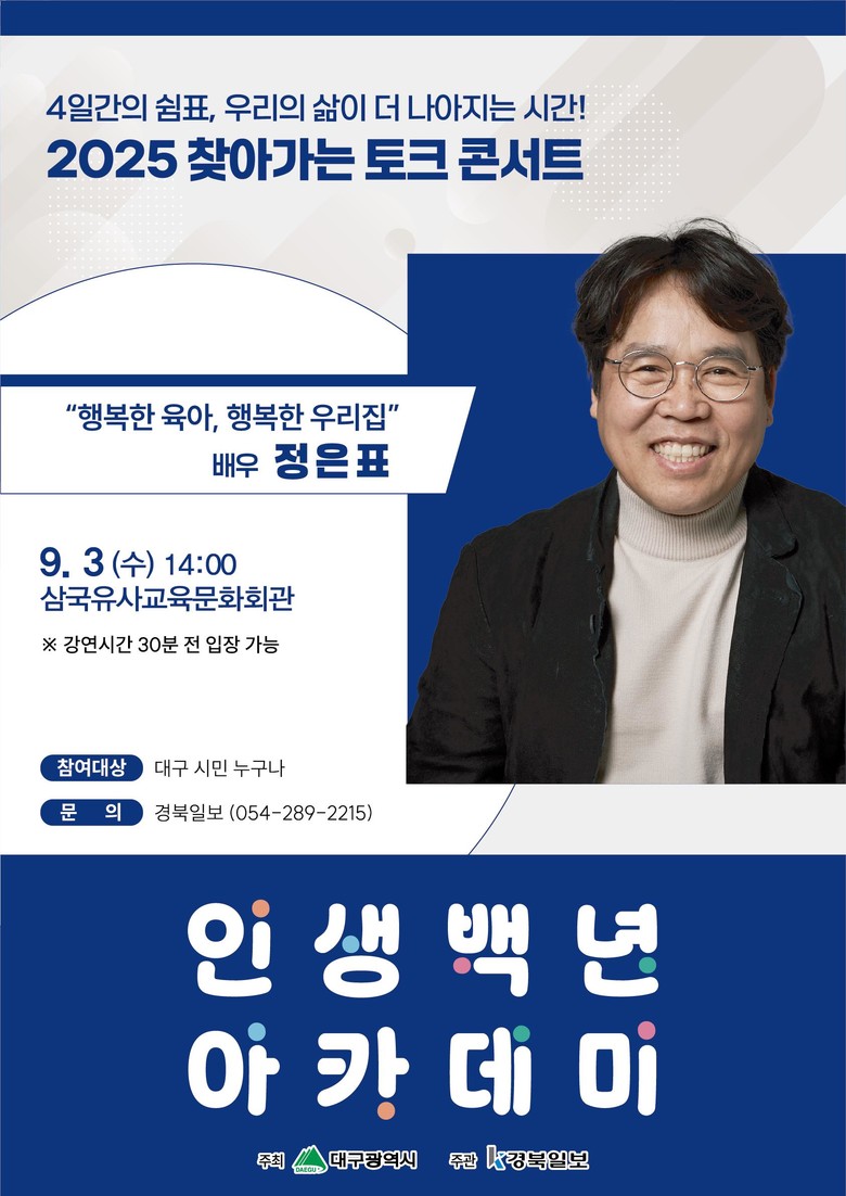 9월 3일(수) 오후 2시 삼국유사교육문화회관에서는 배우 정은표가 ‘행복한 육아, 행복한 우리집’을 주제로 강연을 펼친다. 따뜻한 가족 이야기를 통해 시민들과 공감하는 시간을 마련할 예정이다.