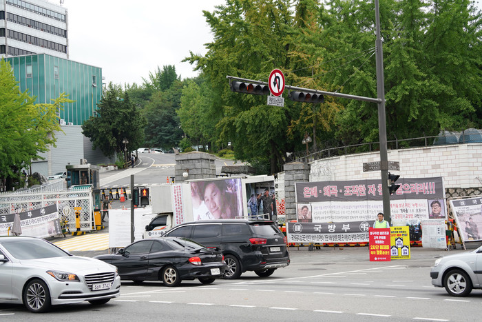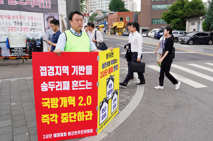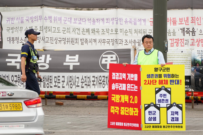[양구군=세계타임즈 김민석 기자] 임경열 양구군의회의원이 29일 서울 용산 국방부 정문에서 2사단 해체철회 피켓을 들고 1인시위를 하고 있다.