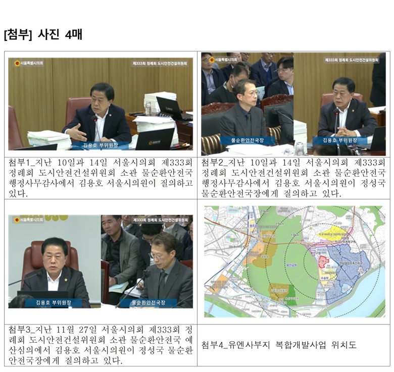 - 서울시와 용산구청에 관련 자료 전면 제출 요구 [서울 세계타임즈=이장성 기자] 서울특별시의회 도시안전건설위원회 부위원장으로 활동하고 있는 김용호 시의원(국민의힘, 용산1)은 지난 10일·14일 행정사무감사에 이어 27일 열린 제333회 정례회 물순환안전국 예산심의에서도 용산 미군반환부지 및 유엔사 부지(더 파크사이드 서울) 일대의 토양·지하수 오염 문제와 환경영향평가 부실 의혹, 토양환경보전법 위반 가능성 등을 다시 한 번 강도 높게 제기했다.