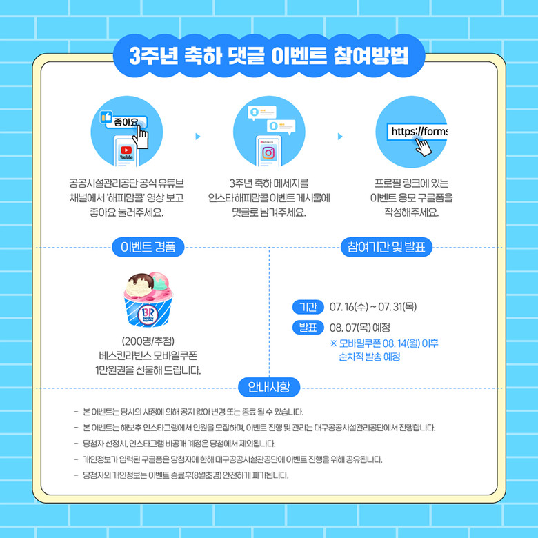대구공공시설관리공단 공식 인스타그램 계정을 통해 참여 가능하며, △3주년 축하 댓글 작성 △신규 회원 가입 이벤트 △캐시백 최대 이용자 선정 등 다양한 방식으로 참여할 수 있다.