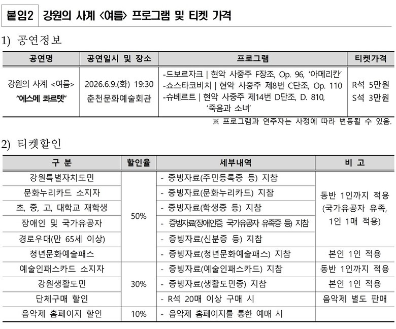 강원의 사계 <여름> 공연 티켓은 3월 19일(목) 오후 2시부터 대관령음악제 누리집(mpyc.kr/tickets)과 NOL 티켓(nol.interpark.com)에서 판매를 진행하며, 가격은 R석 5만원, S석 3만원으로 강원도민, 초.중.고.대학생, 장애인 및 국가유공자 50% 할인(1인 2매) 등 다양한 할인 혜택이 있다. 관련 문의는 평창대관령음악제운영실(033-240-1361)로 하면 된다.