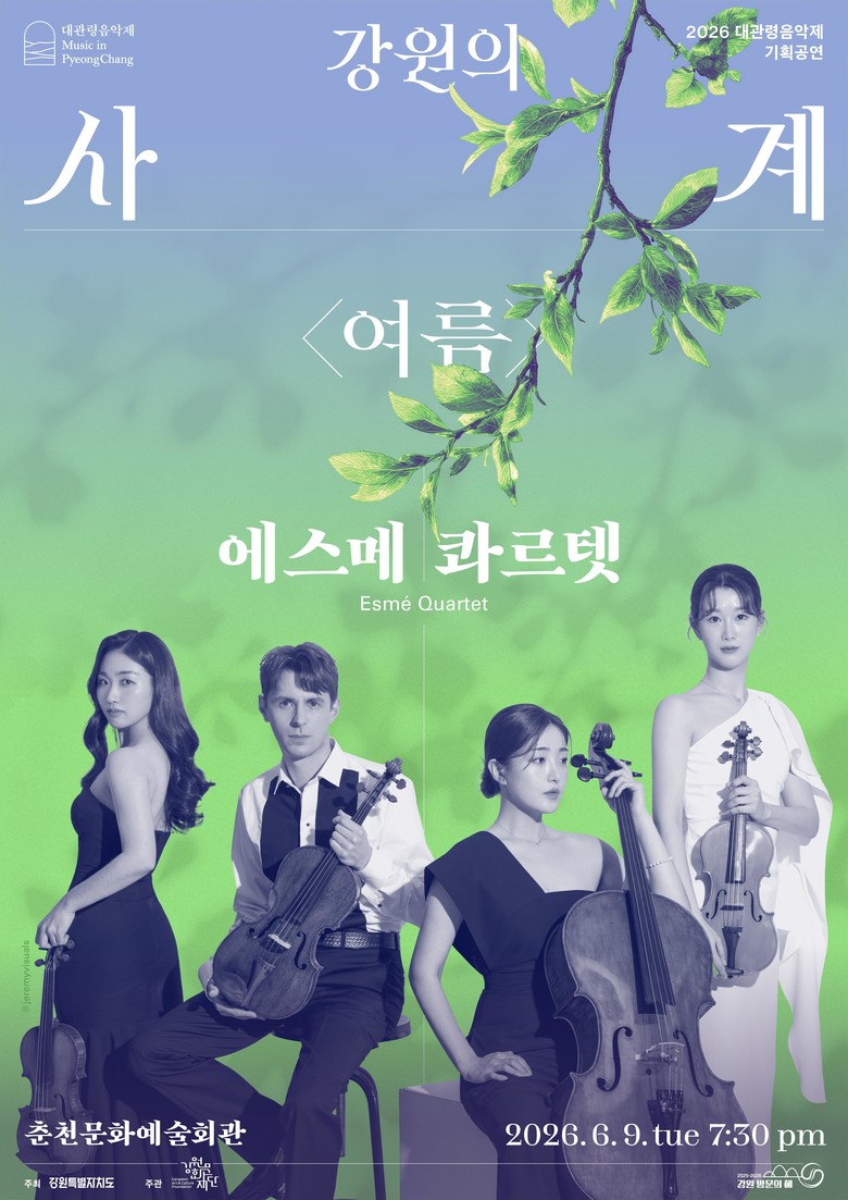 - 6월 9일(화) 오후 7시 30분 춘천문화예술회관에서 완성도 높은 실내악 무대 선보일 예정 [강원도 세계타임즈=김민석 기자] 강원문화재단(대표이사 신현상)은 대관령음악제 기획공연 강원의 사계 <여름> 공연에 세계가 주목하는 현악사중주단 ‘에스메 콰르텟’을 초청해 6월 9일(화) 오후 7시 30분 춘천문화예술회관에서 공연을 개최한다.