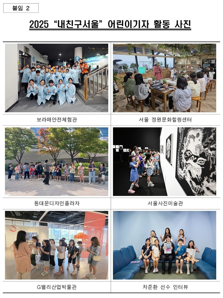 신청은 내친구서울 누리집(kids.seoul.go.kr)에서 가능하며, 지원서와 초상권 활용 동의서와 함께 지정주제 기사 1건(600자 이상)을 제출해야 한다.
